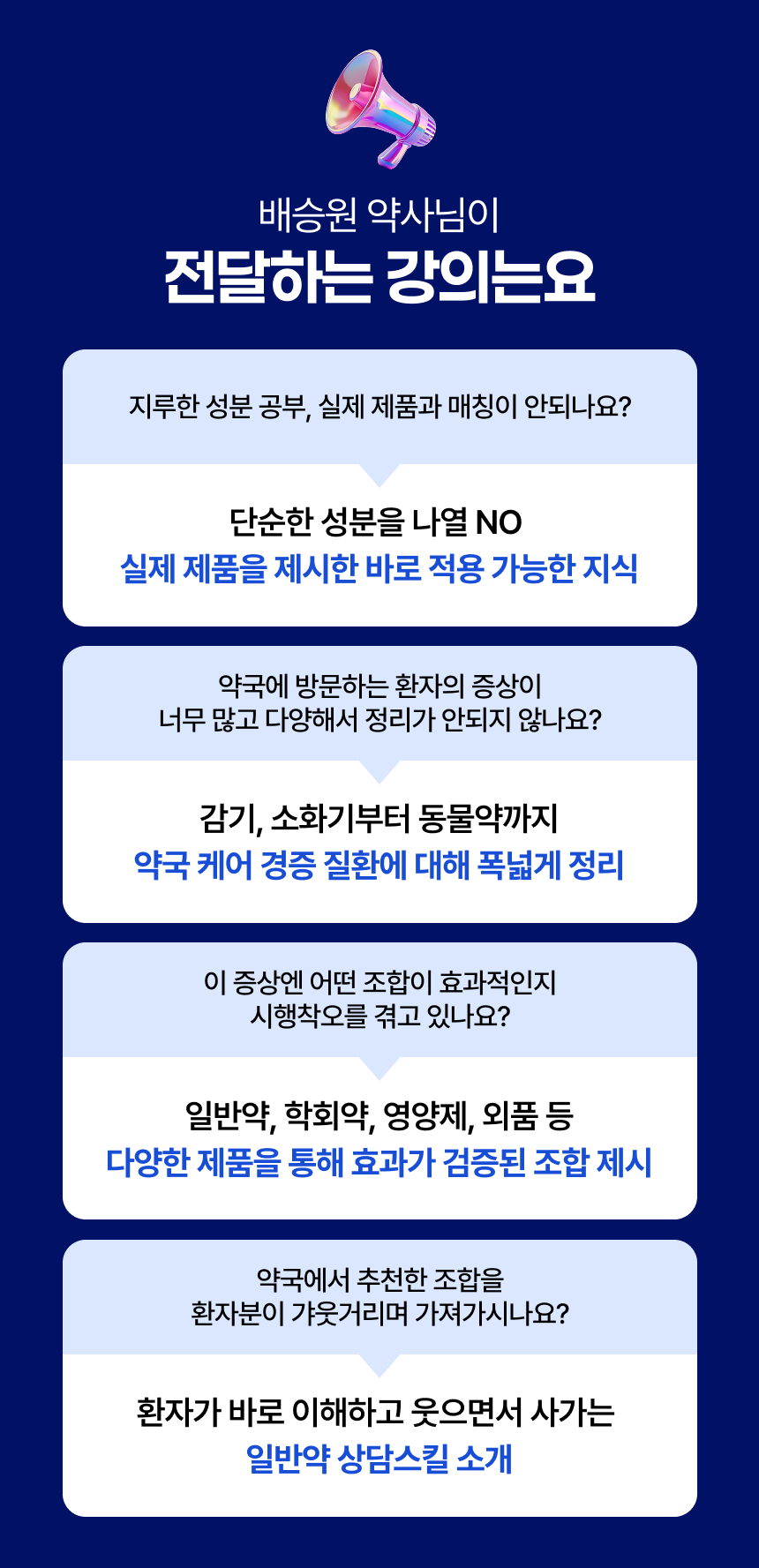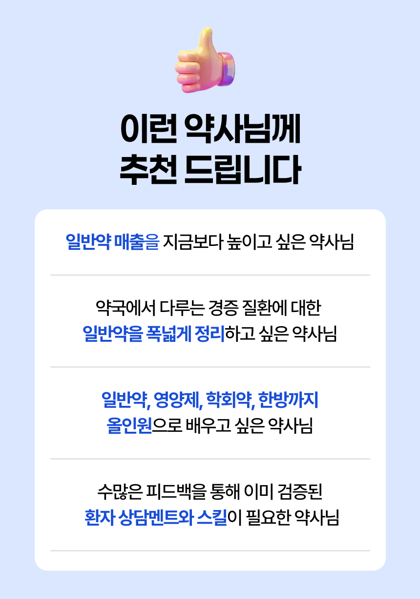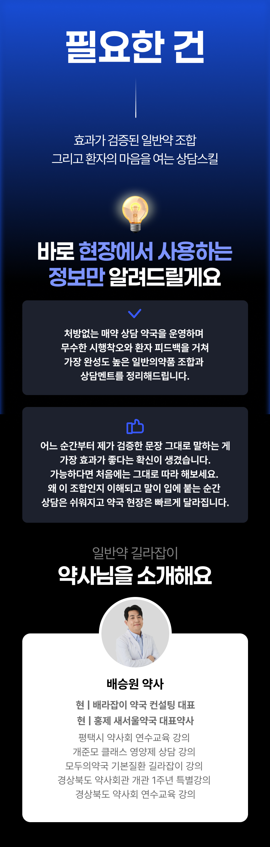 (현) 배라잡이 약국 컨설팅 대표 (현) 홍제 새서울약국 대표약사 (현) 차의과대학원 임상약학과 석사 재학 (전) 우석대학교 약학대학 약학과 졸업 (전) 포항 늘기쁜 약국 대표약사 (전) 의정부 성모약국 대표약사 평택시 약사회 연수교육 강의 개준모 클래스 영양제 상담 강의 모두의약국 기본질환 길라잡이 강의 경상북도 약사회관 개관 1주년 특별강의 경상북도 약사회 연수교육 강의