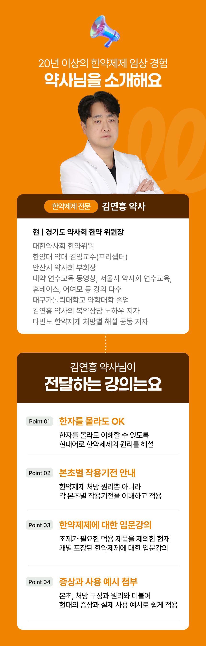 안산시 백제 온누리약국 대표약사 (현)경기도 약사회 한약 위원장 (전) 대한약사회 한약위원 한양대 약대 겸임교수(프리셉터) 안산시 약사회 부회장 대약 연수교육 동영상, 서울시 약사회 연수교육, 휴베이스, 어여모 등 강의 다수 대구가톨릭대학교 약학대학 졸업 김연흥 약사의 복약상담 노하우 저자 다빈도 한약제제 처방별 해설 공동 저자
